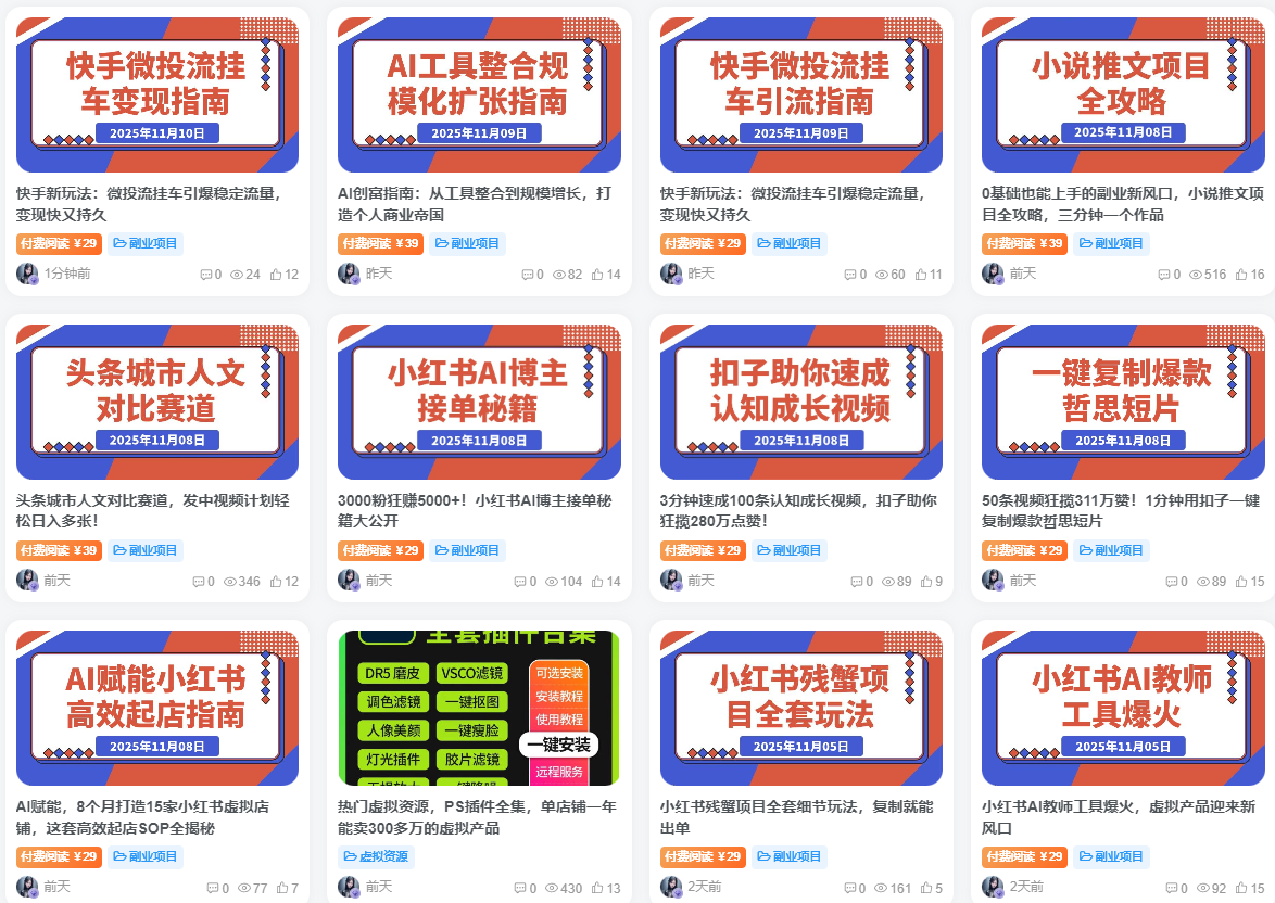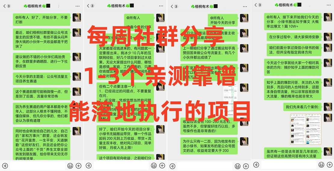 平均每周社群会分享1-3个咱们自己操作过的,绝对靠谱绝对简单的项目,所有项目均有文字版+详细视频课程,就算是小白也能看得懂,也能上手操作,社群项目只要动手操作就一定会有收益!