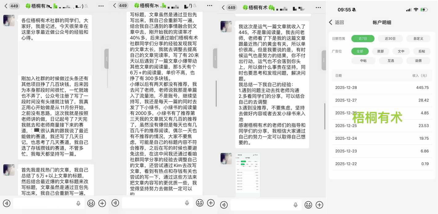 首先我是找热门的文章,我自己总结了5万+以上文章的标题,然后结合最近爆的文章标题来改写标题,文章虽然是通过豆包先写出来,我自己会重新写一遍,结合我自己遇到的事情融合到文章中去,刚开始我的完读率才40%多,后来通过咱们梧桐有术社群同学们分享的经验发现我写的文章太长,我就去调整去提高自己的文章完读率,写了有20来天以后遇到了一篇文章小爆带动其他文章的阅读量,那5天有个6万+的阅读量,单价不高,也挣了有300多块钱。